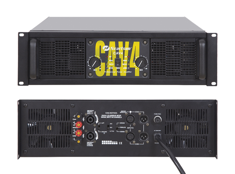 CAV-4/5/6/7系列功放 使用了AB/H类放大电路,采用了进口日本东芝原装塑封管,功率强劲;是集大功率,多功能,高品质,音色还原出众及稳定可靠于一身的好产品。可满足户内外演出全方位应用。 在外观设计,内部结构,电路设计等诸多方面都进行了优化改进,尤其在音色的表现力方面,经过多次反复调校,使其音色的解析力及表现力都十分出众,整机也经过多次破坏性测试,稳定性得以提高,在同类产品中处于领先位置,可与进口名牌产品相媲美。其完善的应用功能,超高的性价比,是你明智的投资选择。